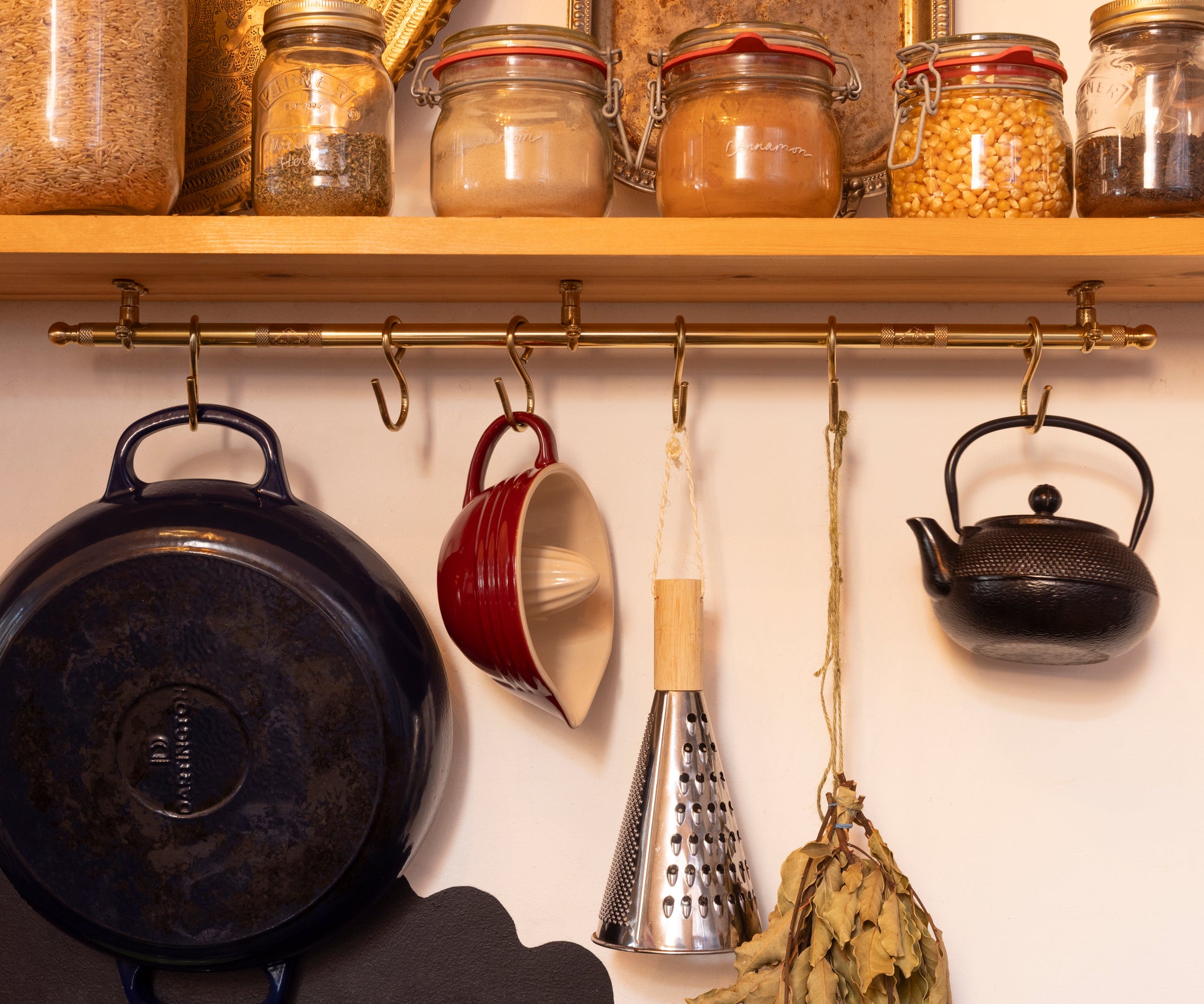 Brass hanging storage for your kitchen, bathroom, anywhere you need it. This would hang very nicely on a wall or under a long wooden shelf.